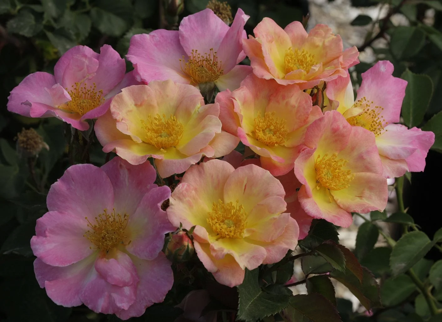 Watercolors Home Run® (‘WEKsolcibarko’) - Large clusters of ruffled single blooms on this shrub rose open bright pink with yellow petal bases and gently transition to shades of pink and cream. Introduced by Weeks Roses.